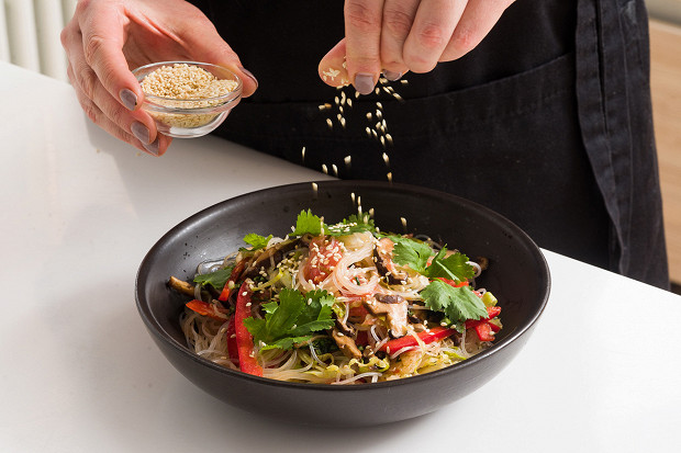 В любом случае бесцветно-безвкусная лапша — идеальный фон для каких угодно кулинарных этюдов. Единственное, чем фунчозе можно навредить, — медлительность. Если прозрачную лапшу передержать в горячей воде, она раскиснет, прозрачные нити слипнутся и станут неопрятными. И на фоне клейстера из фунчозы даже самые яркие сайд-ноты не прозвучат.