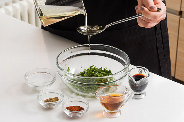 В отдельной емкости приготовьте заправку: соедините 2 столовые ложки соевого соуса, 1 чайную ложку кунжутного масла и 50 мл растительного масла. Добавьте пропущенные через пресс 2 зубчика чеснока, 1 чайную ложку молотого красного перца, 1 чайную ложку молотого кориандра, мелко нарезанные листья кинзы и хорошенько перемешайте.