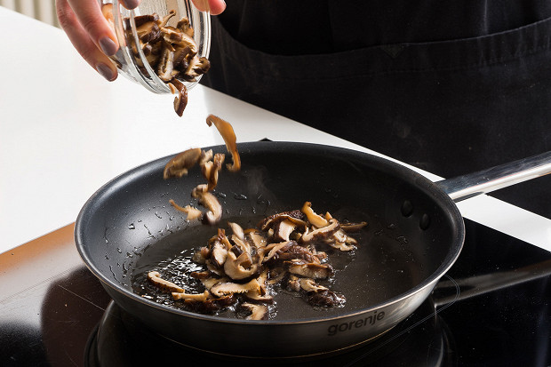 Шиитаке (100 г) сначала отварите, затем нарежьте ломтиками и обжарьте на сковороде на растительном масле до готовности.
