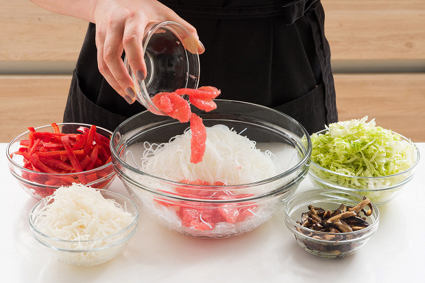 Добавьте в миску к фунчозе все подготовленные ингредиенты: дайкон, грейпфрут, шиитаке.