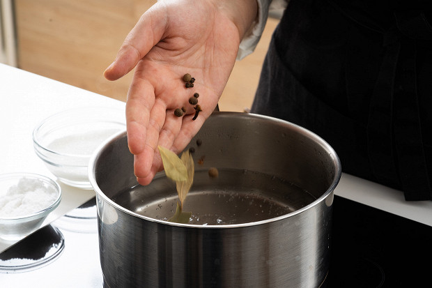 Приготовьте маринад: добавьте в литр холодной воды две столовых ложки соли, одну столовую ложку сахара, пять горошин душистого перца, шесть горошин черного перца, два бутона гвоздики, одну чайную ложку горчицы и три лавровых листа. Постарайтесь не пренебрегать горчицей — она дает огурцам невероятную душистость и пряность.