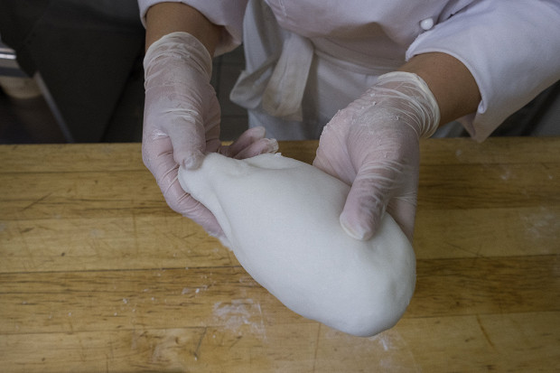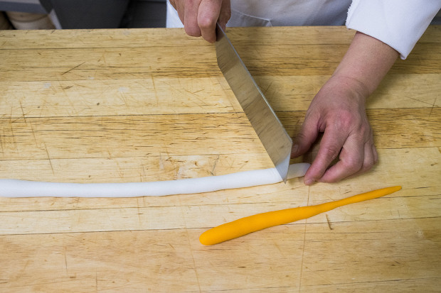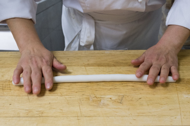 Затем отрываем от белого теста 50 г и раскатываем его в колбаску. После него следующие 50 г — и так далее. Катать лучше руками без перчаток, чтобы лучше чувствовать текстуру.