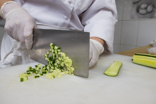 Теперь начинка. Берем огурец, разрезаем вдоль на четыре части, отрезаем семечки: серединка огурца слишком водянистая, а лишняя влага нам не нужна. Можно сказать, нам нужно огуречное мясо. Оставшуюся часть надо нарубить мелкими кубиками. Получится примерно 30 грамм огурца.