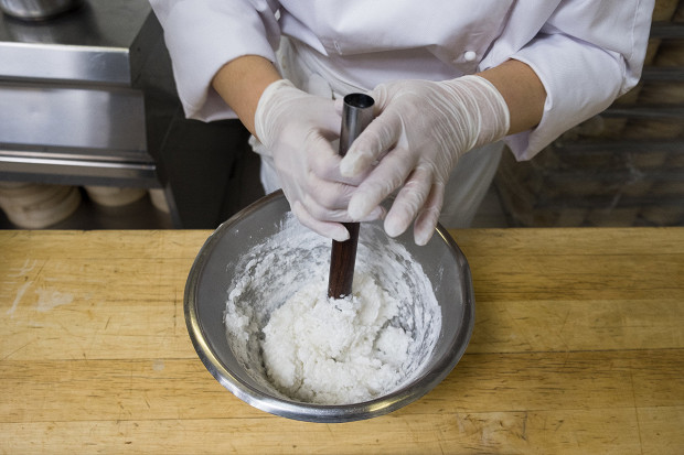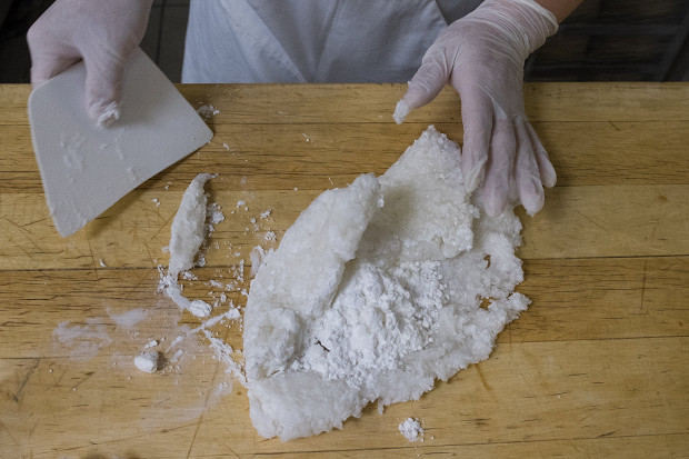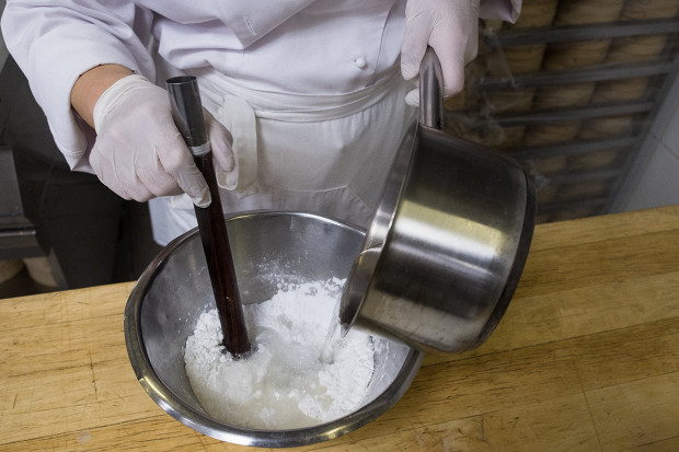 Когда все превратится в более-менее однородный комок, надо выложить его на деревянную доску, приплющить ладонью или кондитерским шпателем. В центр насыпать 90 грамм пшеничного крахмала, завернуть его в тесто, как в конверт, и дальше вымешивать тесто руками.