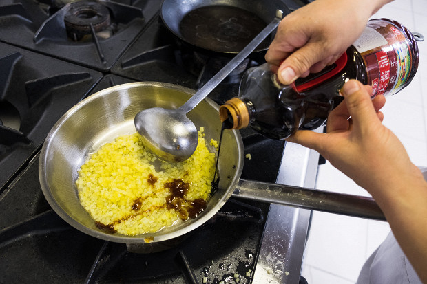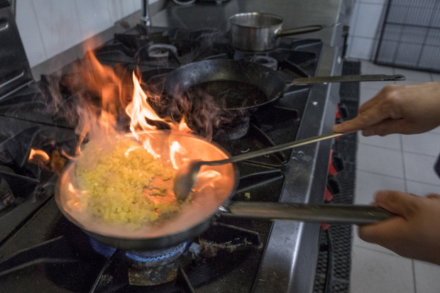 Картофель нужно обжарить в луковом масле. Его мы делаем сами: обжариваем половину головки репчатого лука в 30 мл растительного масла до золотистого цвета, лук выбрасываем, а масло оставляем. Можно использовать и обычное растительное масло. Мы обжариваем на раскаленном масле, так, как показано на фотографии, но это тоже необязательно — можно просто обжарить в течение 3 минут, постоянно помешивая, без лишних визуальных эффектов.