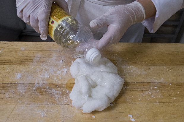 Когда тесто станет более-менее гладким, надо налить на него 20 мл растительного масла. Это нужно для того, чтобы плотнее скрепить ингредиенты между собой и чтобы тесто не рвалось, а равномерно растягивалось.