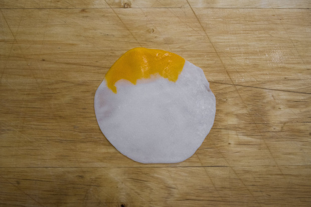 Надо расплющить кусочки теста, положить желтое на белое, немного смещая его к краю — и растянуть тесто плоским ножом от центра к краям. Это тоже наш китайский способ, мы ножи специально из Китая заказываем. Скалкой тоже можно раскатать — главное, чтобы стол или поверхность, на которой вы раскатываете, были устойчивые, иначе не удастся равномерно растянуть тесто.