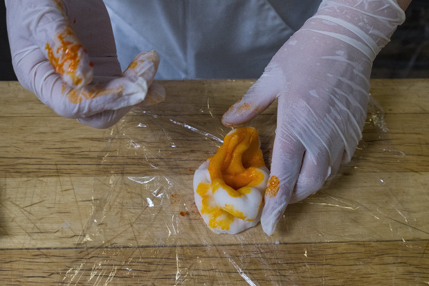 Нужно оторвать от теста кусочек весом 50 грамм, остальное убрать под пленку. Положить на доску пленку, на нее — тесто, затем добавить к нему 20 мл пищевого красителя. Вообще, количество красителя зависит от вашего визуального представления. Пропорция цветного теста — тоже дело вашего вкуса. Кто-то любит, чтобы цвета было чуть-чуть, а можно сделать тесто цветным целиком. Цветные дим-самы любят на юге Китая: в Шанхае, Гуанчжоу. Ну и в Пекине, там все со всей страны собрано.
