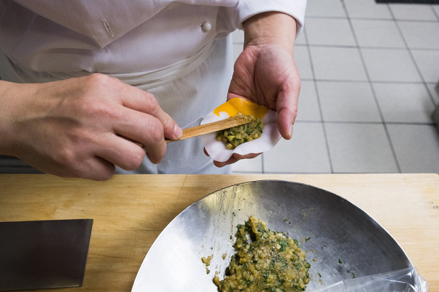 Овощные дим-самы готовятся на пару очень быстро, в течение двух с половиной минут. Мясные и рыбные — около пяти минут. Мы готовим в бамбуковых пароварках. Дома можно приготовить как в бамбуковой пароварке (для этого надо поставить ее на кастрюлю с кипящей водой), так и в обычной. Время рассчитывайте на глаз: когда тесто станет прозрачным, тогда и готово. Но в среднем, как я и говорила, овощным дим-самам нужно 2–3 минуты.