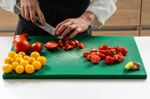 Возьмите 260 грамм сливовидных помидоров, 280 грамм простых круглых красных томатов и 280 грамм желтых помидоров черри. Идеально, если какие-то помидоры будут слегка переспелыми, а какие-то покрепче, — это сделает структуру джема интересней. Порежьте их кубиком. Сливку лучше резать потоньше, чтобы она развалилась и стала основой джема. Простые круглые помидоры лучше резать покрупнее, так сохранится их текстура. Черри можно порезать пополам. Если вам достались помидоры с дубовой кожицей, то лучше ее снять — иначе она будет потом мешать в джеме. Но если кожица мягкая, то лучше ее оставить — она придаст джему дополнительную ароматику. Обычно мы срезаем у томатов шершавую ямку, к которой крепится плодоножка, но в джеме ее лучше оставить — с ней он получится куда душистей.