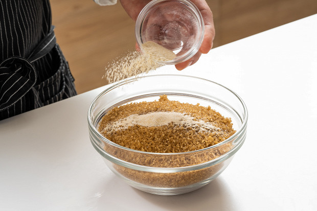 Перемешайте 410 грамм тростникового сахара и 3 грамма пектина. Это нужно, чтобы во время варки пектин не превратился в комок. Если вы хотите, чтобы джем был кислым, то нужно уменьшить количество сахара до 300 грамм, взять 5 грамм пектина и в два раза увеличить количество рисового уксуса, который мы добавим на следующих этапах, — вместо 25 мл взять 50.