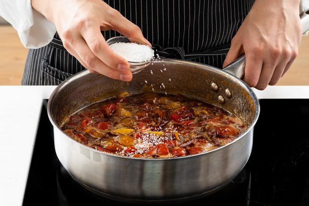 Когда джем уже будет готов, но еще будет слегка кипеть — добавьте в него морскую соль. Пропорций не скажу, ориентируйтесь на свой вкус. Не добавляйте соль раньше, тогда уксус и сахар не вступят в нужное взаимодействие. Если вы будете консервировать джем, то соль нужна обязательно. Если собираетесь съесть джем в ближайшее время — можно и без нее.