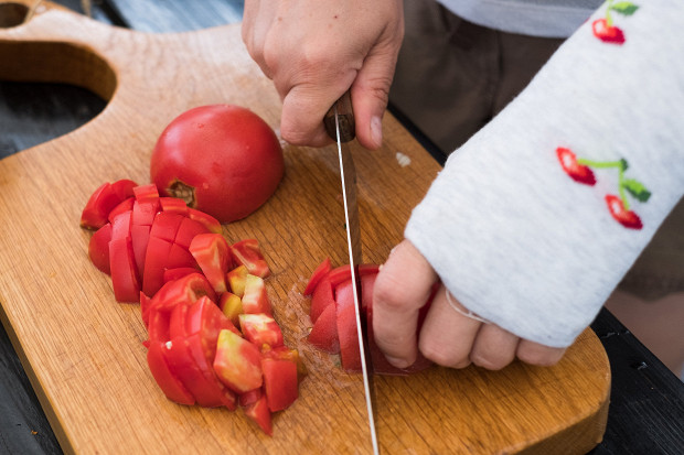 Помидоры для меня — отдельная песня: дайте мне помидор, сыр — и все, мне достаточно! Летом, когда на рынке много свежих овощей, в икру можно добавить любые помидоры, главное, спелые. Осенью берите сливовидные, они самые недорогие и вкусные. Но сливка сливке рознь, она бывает толстошкурая, тогда нужно будет ее очистить.