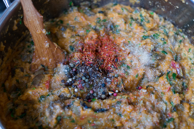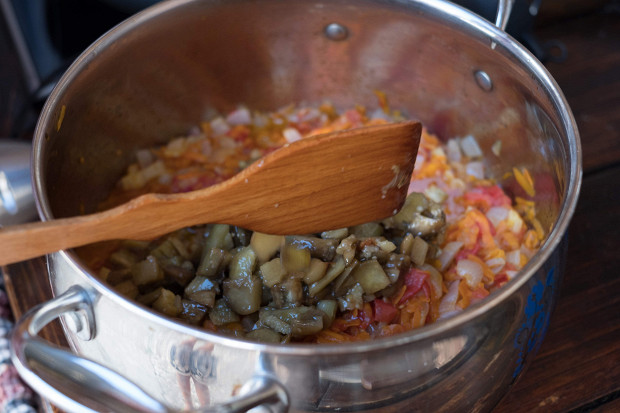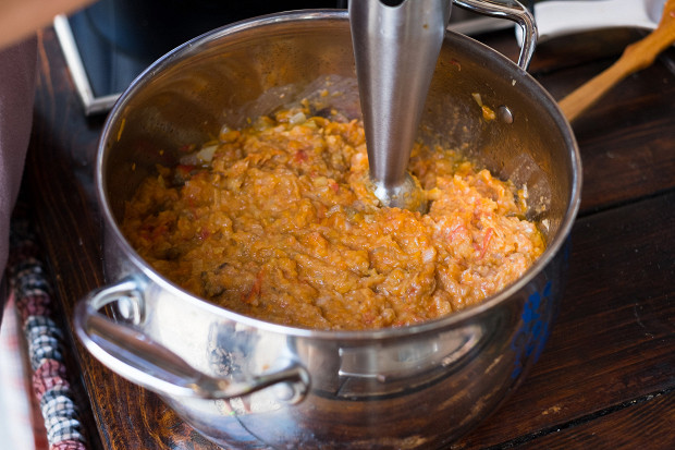 Существует два способа подготовки ингредиентов для икры. Можно все почистить и по отдельности потушить, а затем смешать — а можно запечь в духовке и потом почистить. Если запечь баклажаны на костре, у них появится характерный запах дымка. Но я прекрасно понимаю, что в Центральной России не у всех есть дачи, а костер и мегаполис — вещи не всегда совместимые.