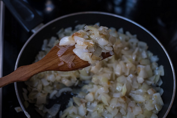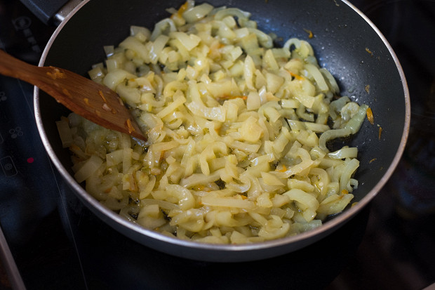 Готовить надо все ингредиенты по отдельности. Так понятно, когда что готово. А если все смешать, то морковь приготовится, лук не дойдет — и получится не то пальто. В принципе, тушить овощи можно в любом порядке, но я для себя определила такой. Начинаю с лука. Наливаю в сковороду растительное масло, кидаю лук и довожу его до золотисто-прозрачного состояния. Для этого сначала минут пять его надо обжаривать на сильном огне, помешивая, а затем примерно пять-десять тушить на небольшом огне, закрыв крышкой.