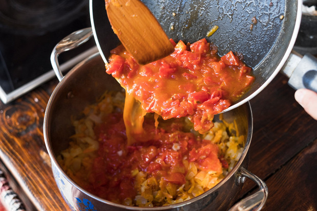 Перец забирает почти все масло, так что надо снова налить немного и приготовить помидоры. Все то же самое, что и с предыдущими овощами. Помидоры дают много жидкости, и это и есть та жидкость, которая будет в икре. На последней стадии приготовления томатов надо добавить пару зубчиков чеснока; на мой взгляд, чеснок прекрасно оттеняет помидорную тематику. Надо пару минут все вместе протушить, а затем добавить готовые помидоры в кастрюлю к прочим овощам и приступить к баклажанам.