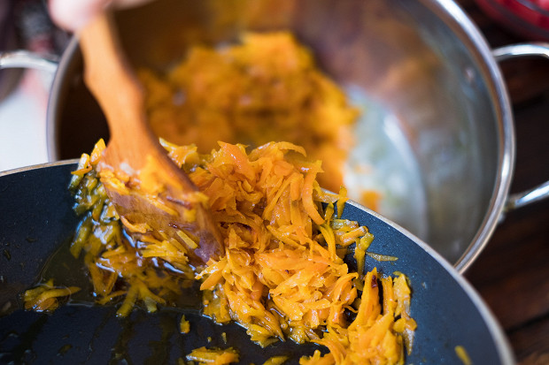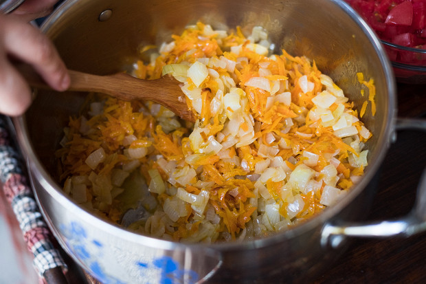 Перекладываю лук в кастрюлю, доливаю масла в сковороду и кидаю морковь. Морковь тоже должна стать чуть прозрачной. Готовим ее так же, как и лук, — сначала на большом огне, а затем под крышкой на небольшом. Она возьмет больше масла, чем лук, поэтому я изначально лью больше масла на сковороду. Если посолить, то она даст воду, поэтому овощи, когда готовлю их по-отдельности, я не солю.