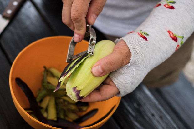 У многих есть такая штука: они не могут есть баклажаны, губы опухают или язык — огромное количество людей не едят баклажаны именно поэтому. Но если очистить баклажан или дать ему полежать в крутом соляном растворе минут 15–20, то они, во-первых, не потемнеют, а во-вторых, отдадут горечь и кислоту. Мы наши баклажаны почистим. Как по мне, так проще.