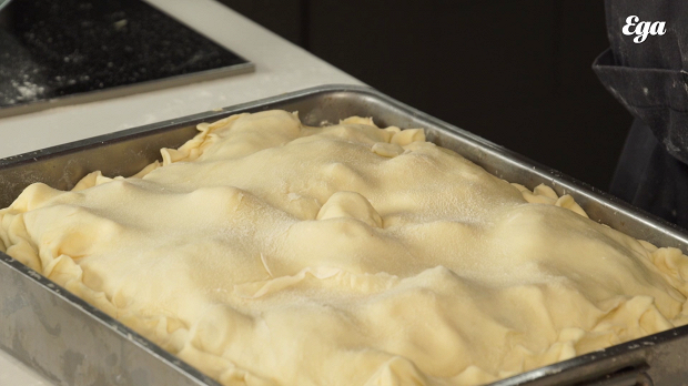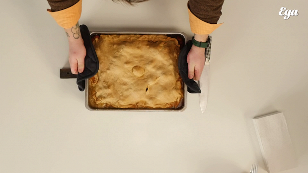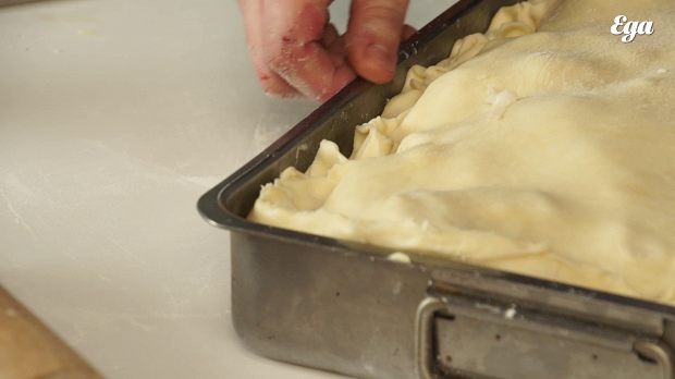 Раскатайте оставшееся тесто. Накройте им бэлиш. У вас останется лишнее тесто по бокам формы — аккуратно его отрежьте. Защипайте края пирога — произвольно, вовсе не обязательно делать это аккуратно, вам просто нужно герметично запечатать бэлиш.