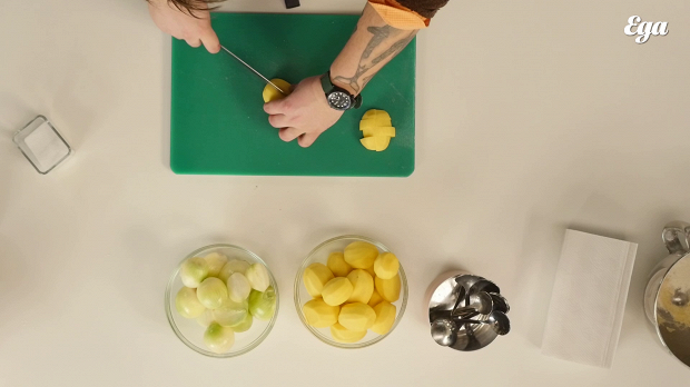 Тем временем подготовьте начинку. Нарежьте полтора-два килограмма картошки крупными кубиками. Зур-бэлиш хоть по названию и пирог, но по сути это жаркое, и в нем должна ощущаться текстура картофеля. Бэлиш проведет в духовке два часа, и маленькие кусочки картошки за это время превратятся в кашу, а нам это совсем не нужно.