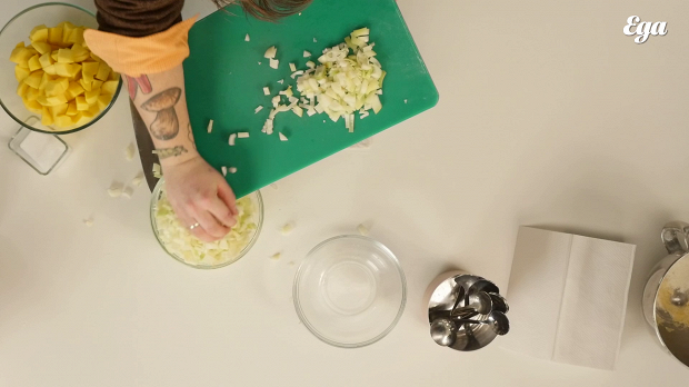 Полтора-два килограмма репчатого лука нарежьте кубиками с ребром в сантиметр. После двух часов в духовке запах лука, да и сам лук практически растворятся, зато останется сок. Бульон — одна из главных особенностей зур-бэлиша. Когда вы вскроете готовый пирог, начинка будет почти полностью покрыта вкусным бульоном.