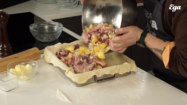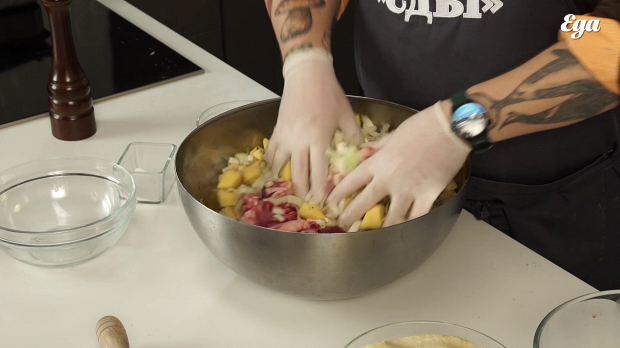 Смешайте куски утки, лук и картошку. Посолите на ваш вкус. Если боитесь промахнуться, то вот удобная формула: соли нужно плюс-минус 2 процента от массы начинки. Следом поперчите. Нужно много молотого черного перца. Никаких других специй и приправ, кроме соли и перца, в бэлише нет. Перемешайте начинку. И хорошо бы дать начинке немного постоять и помариноваться.