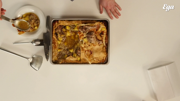 Разложите начинку по глубоким тарелкам вместе с бульоном. Добавьте в нее куски теста. Ешьте, макая хрустящее тесто в бульон. А когда дойдет дело до нижней, пропитанной маслом и бульоном корочки, вы поймете, что в зур-бэлише самое вкусное.