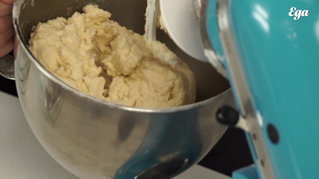 Размешивайте масло с мукой в миксере около пяти минут, пока не добьетесь текстуры мокрого песка. Добавьте в тесто чайную ложку соли и ледяную воду. Воду надо добавлять на глаз, ее нужно столько, сколько будет достаточно для связки ингредиентов. Перемешайте тесто еще раз, но уже не так долго, не более двух минут. Долгое перемешивание приведет к тому, что тесто станет эластичным, а это не нужно. Сформируйте из теста полусферу, уберите ее в холодильник на 20 минут.