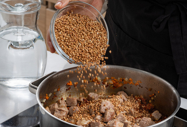 Когда мы взялись снимать этот мастер-класс, одна половина редакции хотела готовить гречку с говядиной — ее сладкая терпкость хорошо бы сложилась с гречкой, вторая половина голосовала за свинину, так как это не менее вкусно, но гораздо дешевле. Разум победил чувства, мы выбрали свинину, о чем ничуть не жалеем — получилось замечательно!