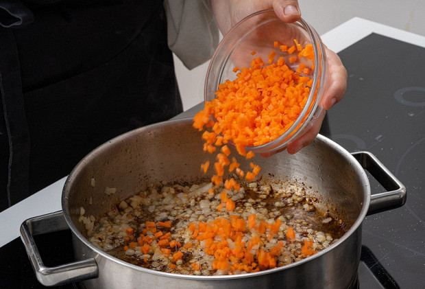 Затем добавьте к луку морковь и жарьте еще 3–4 минуты.