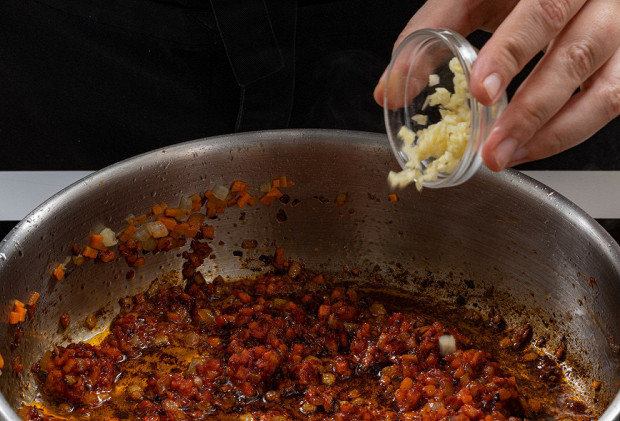 После этого добавьте томатную пасту. Готовьте эту зажарку еще 1 минуту, постоянно помешивая. Затем добавьте к смеси мелко нарезанный чеснок и жарьте еще 30 секунд. Не кладите чеснок до этого: он быстро сгорает, а вот оказавшись в сковороде в последний момент, ведет себя хорошо.