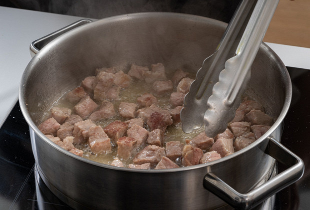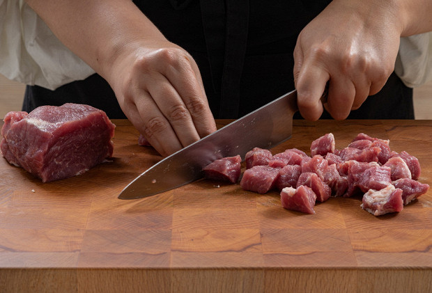 Нарежьте свинину небольшими кубиками. Пусть сторона каждого кубика будет около 1 см. Меньше — мясо превратится в труху, больше — придется его чуть дольше готовить.