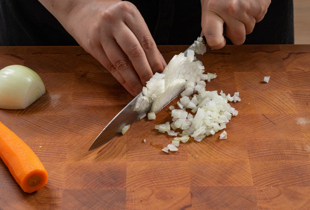 Мелко нарежьте лук и морковь. В той же сковороде, где готовилось мясо, обжарьте до золотистого оттенка лук.