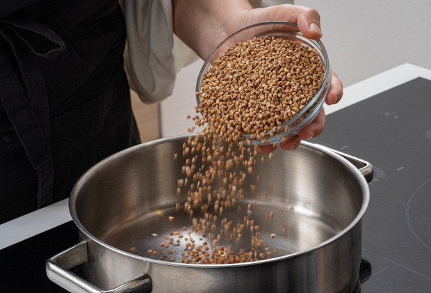 Положите гречку в сухую раскаленную сковородку. Прокаливайте ее 2–3 минуты, пока крупа не начнет потрескивать и источать характерный гречневый запах. Прокаливать гречку необязательно, но этот процесс делает крупу ярче, избавляя ее от лишней влаги и обостряя ее аромат. После этого пересыпьте ее в чистую посуду.