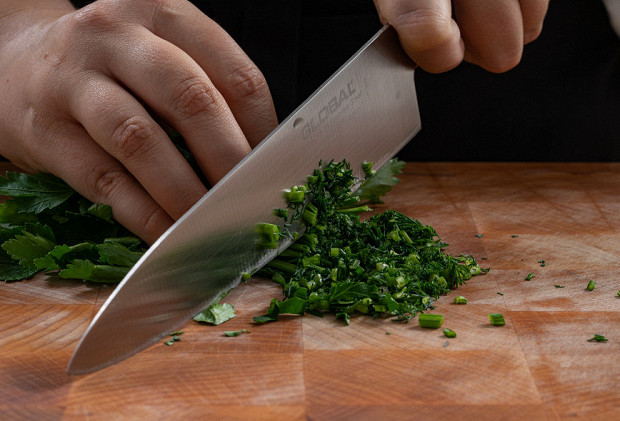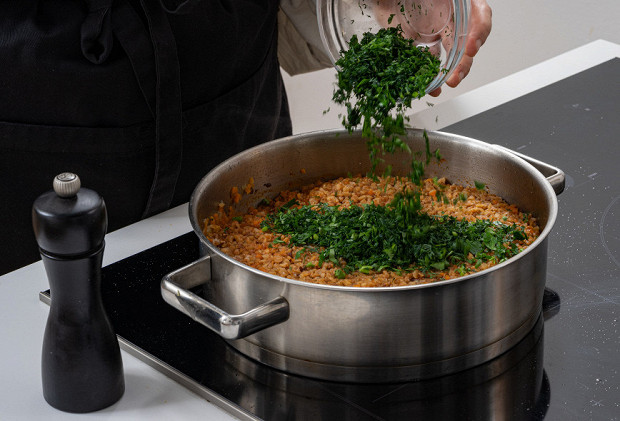Попробуйте гречку. Если надо, посолите. Если нужно, добавьте черный перец. Добавьте измельченную зелень и перемешайте.