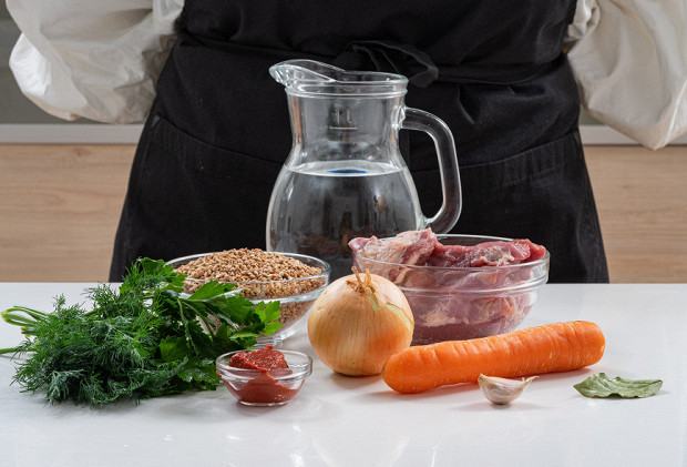 Подготовьте все ингредиенты: 280 грамм гречневой крупы, 300 грамм свинины, 1 головку репчатого лука, 1 морковь, 1 зубчик чеснока, 30 грамм томатной пасты, 700 мл воды, 40 мл растительного масла, по 20 грамм петрушки и укропа, лавровый лист, соль и черный молотый перец.