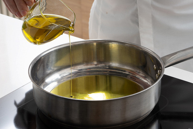 Налейте оливковое масло в глубокий сотейник с толстым дном. Включите средний огонь: масло должно нагреваться постепенно, не резко.