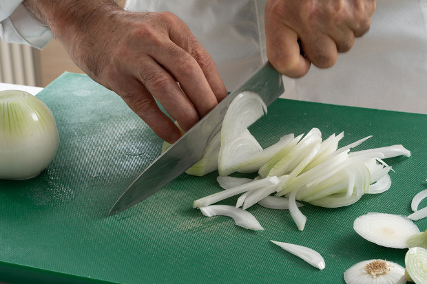 Пока масло достигает нужной температуры, порежьте лук тонкой соломкой. Чем тоньше будет нарезан лук, тем нежнее будет текстура. Идеально, если толщина соломки составит 1 мм.