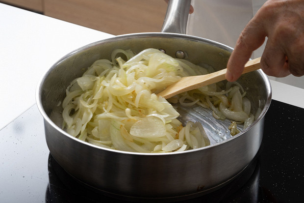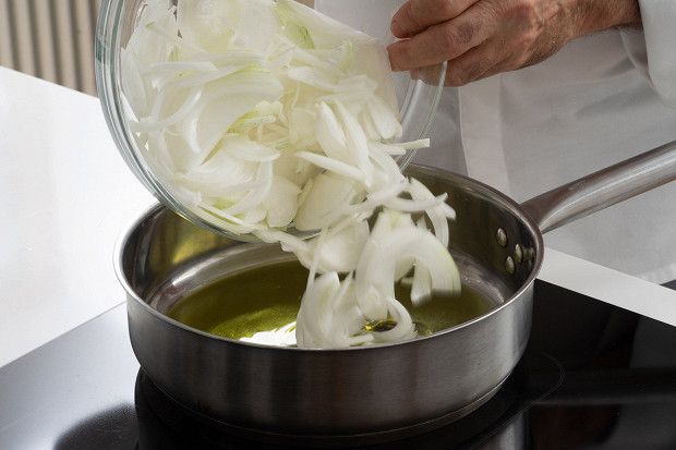 Отправьте лук в сотейник с оливковым маслом. Включите сильный огонь и обжаривайте примерно 10 минут. Сначала из лука начнет выходить сок, который довольно быстро начнет испаряться. Если вам кажется, что влага выходит медленно и лук никак не поддается тушению, — добавьте к нему чуть-чуть соли. Через 10 минут лук должен стать прозрачным, если этого не произошло — добавьте к готовке еще несколько минут.