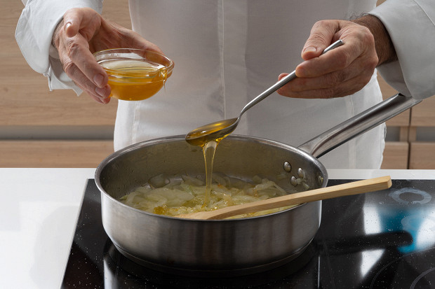 Добавьте к луку мед, увеличьте огонь и жарите еще 2 минуты, постоянно помешивая. Здорово, если мед будет жидким: так его проще будет быстро распределить по луковой массе. На этом этапе лук приобретет легкую карамельную корочку.