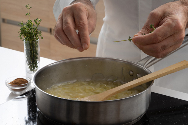 Снимите листики тимьяна с веточки. Добавьте их к луку. Отправьте туда же одну или две щепотки молотой корицы. Тушите будущий конфитюр до уверенного карамельного цвета.
