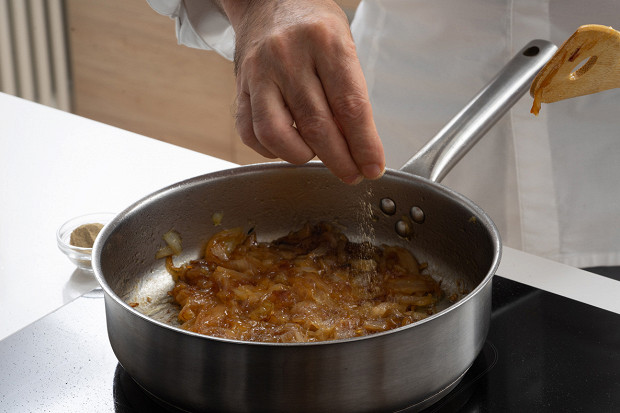 И в-третьих, в этом блюде очень важен перец, который нужно добавить в самом конце, чтобы он случайно не подгорел. Не советую брать черный: он лучше всего подходит мясу, и он испортит цвет конфитюра. Лучше всего сюда пойдет белый перец: он элегантней и сложнее».