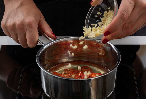 Поставьте сотейник на средний огонь. Влейте растительное масло так, чтобы оно полностью покрыло дно сковороды, добавьте перец чили и ⅔ чеснока.