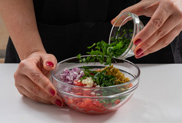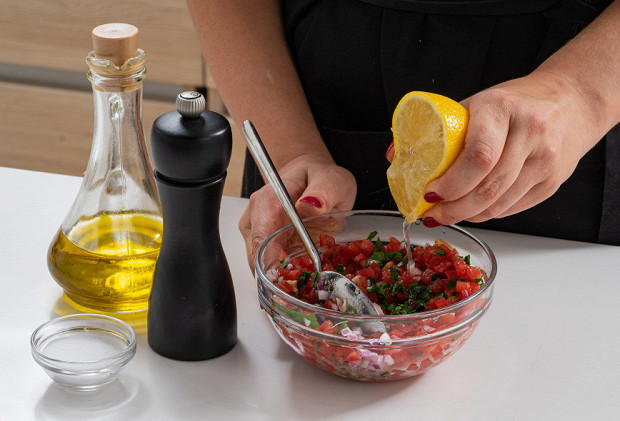 Заправьте сальсу оливковым маслом, лимонным соком, посолите и поперчите.