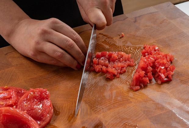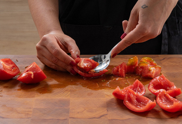 Приготовьте томатную сальсу. Помидоры разрежьте пополам, уберите ложкой внутренности с соком.
