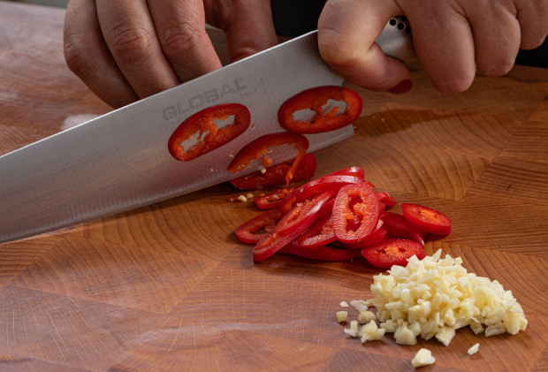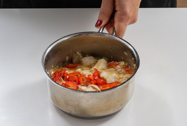 Чеснок мелко нарежьте, перец чили нарежьте колечками (если хотите чуть снизить остроту, можете удалить из него семена).