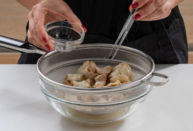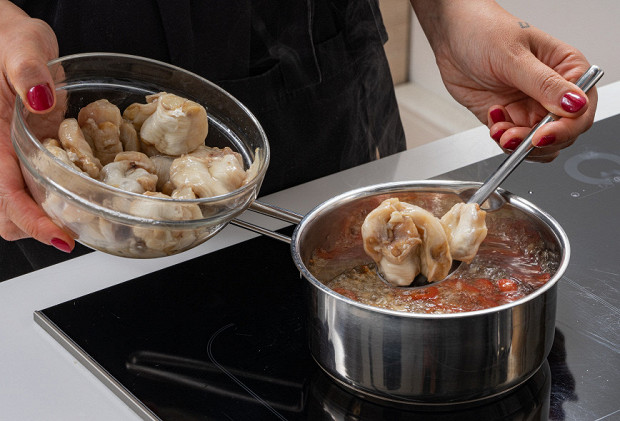 Прежде всего поставьте вариться картошку — за полчаса, которые на это понадобятся, вы как раз успеете приготовить все остальное. Язычки извлеките из банки, жидкость слейте, уберите крупные фрагменты специй.