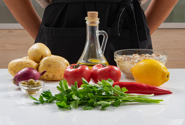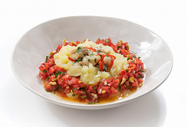 В нашем распоряжении оказалась литровая банка с язычками, консервированными в масле со специями. При извлечении из банки собственно язычки потянули на 300 грамм. Исходя из этого, мы и рассчитали количество всех остальных ингредиентов. Нам понадобилось 100 грамм растительного масла для фритюра, 3 зубчика чеснока, 1 перец чили и 400 грамм картофеля на гарнир. А также 200 грамм помидоров, 6 оливок, 1 столовая ложка хорошего оливкового масла, ¼ головки красного лука и пучок петрушки для томатной сальсы.