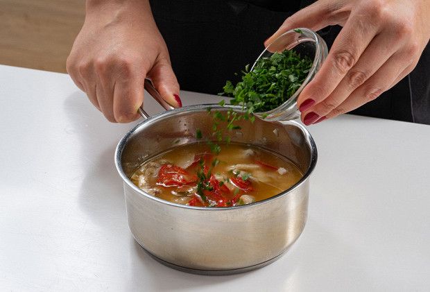 Добавьте в сотейник половину измельченной петрушки и оставьте сотейник около плиты, чтобы соус стал единым целым и язычки им хорошенько пропитались.