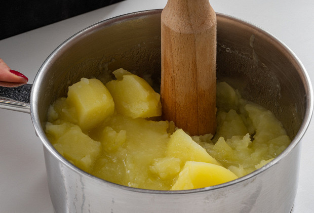 Тем временем вернитесь к картошке: она уже сварилась. Осталось слить воду и размять ее в фактурное пюре с кусочками.